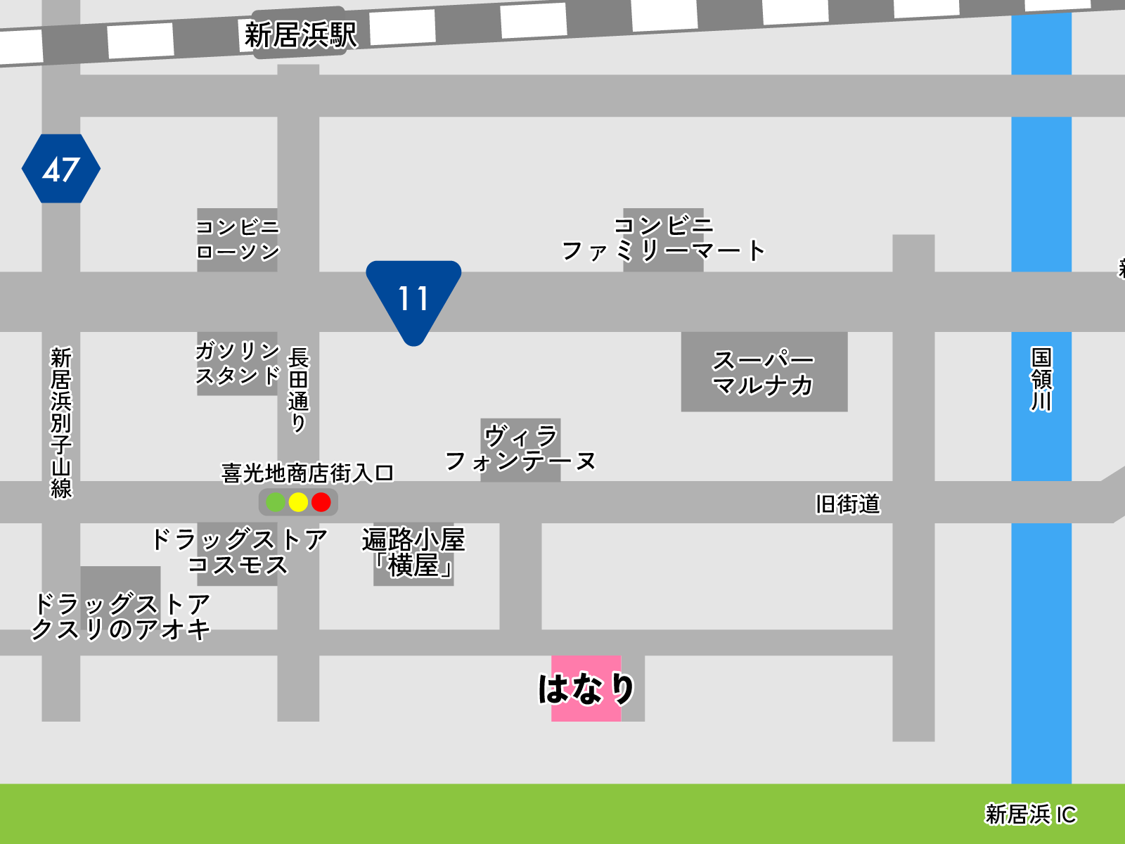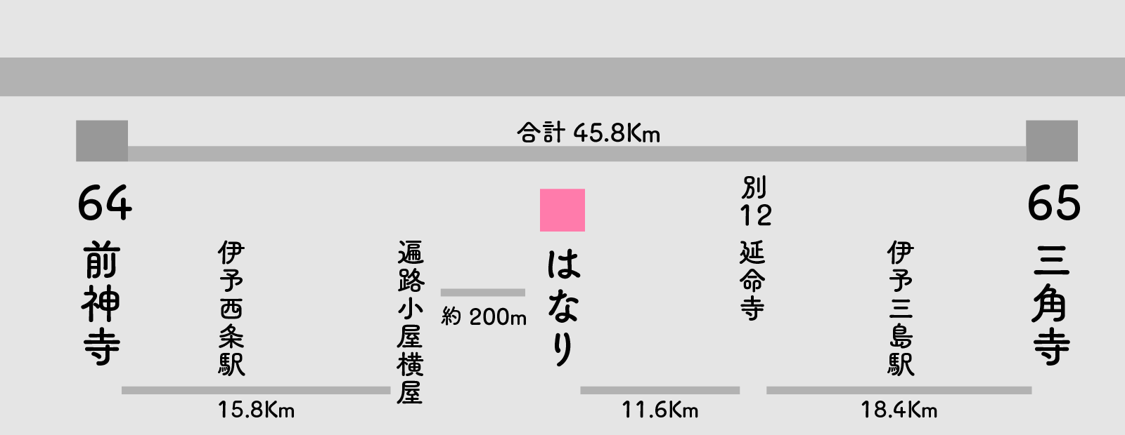 第64番地 前神寺(西条市洲之内甲1426)と第65番地 三角寺(四国中央市金田町三角寺甲75)の中間地である愛媛県新居浜市にあり、休憩地として最適な場所に立地しています。